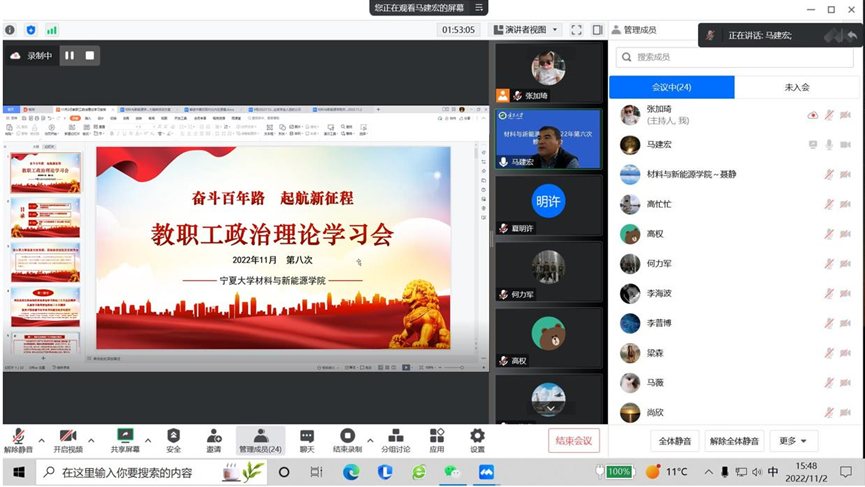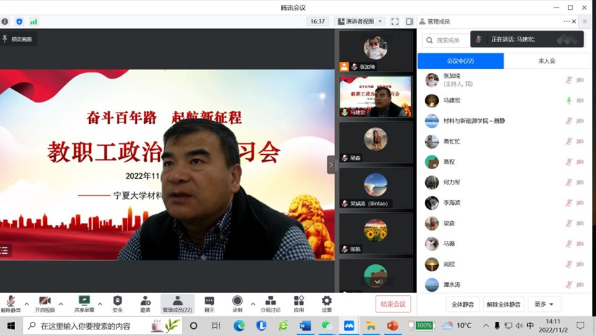 2022年11月2日下午,学院通过线上会议形式召开了2022年第八次教职工政治理论学习会。会议由直属党支部书记马建宏同志主持并领学,学院全体教职工参会。