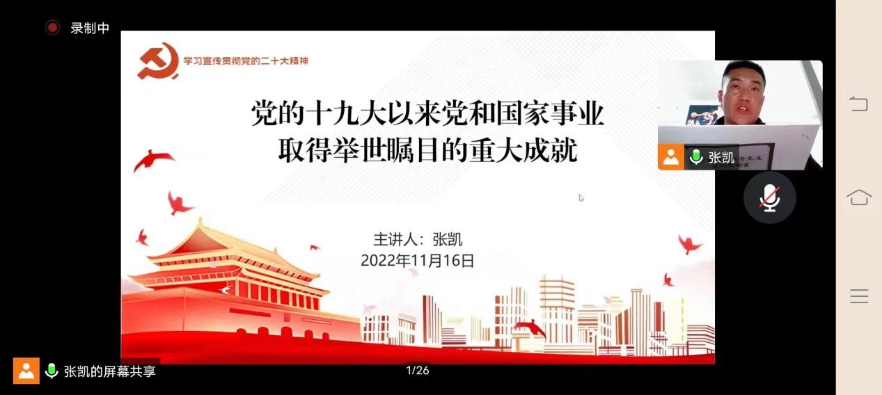 会议中,张凯带领大家认真学习了党的二十大报告原文,并观看了系列节目之《奋斗新的伟业:非凡成就,伟大变革》。分别从5年来党中央作出的一系列事关全局的重大部署,5年来党和国家办成的一系列事关长远的大事要事,5年来党领导人民成功应对的一系列前所未有的重大风险挑战以及牢记初心使命、开创美好未来四个方面进行了深入的学习交流。