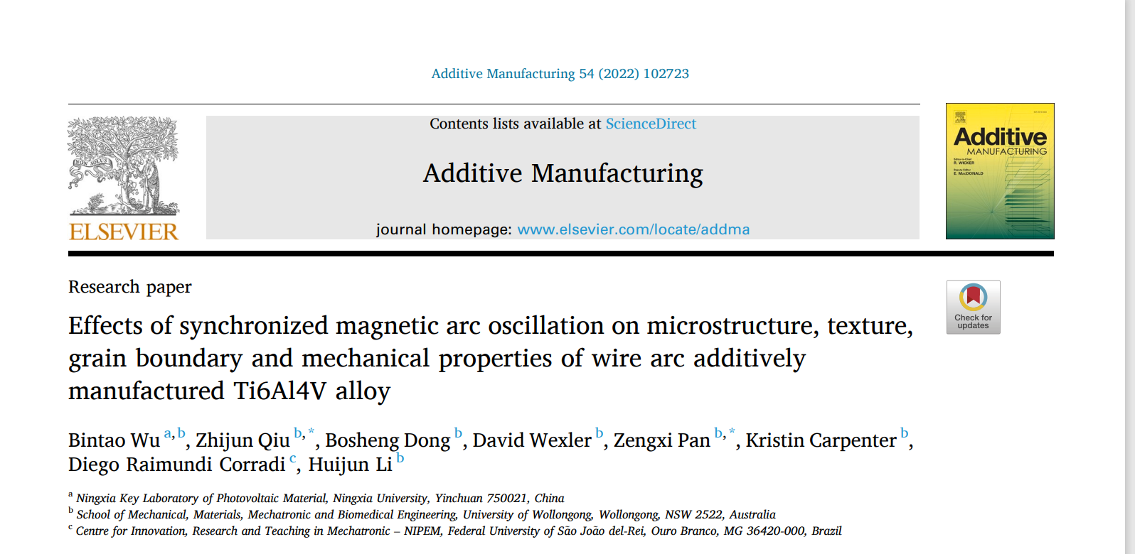 近日,宁夏光伏材料重点实验室吴斌涛副教授团队在电弧熔丝增材制造钛合金研究领域取得重要科研进展,其论文“ Effects of synchronized magnetic arc oscillation on microstructure, texture, grain boundary and mechanical properties of wire arc additively manufactured Ti6Al4V alloy”发表在国际增材制造领域顶刊《Additive Manufacturing》(IF=11.632,中科院一区top期刊)上,论文以性吧