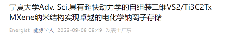 相关成果以“Self-Assembled Two-Dimensional VS2/Ti3C2TxMXene Nanostructures with Ultrafast Kinetics for Superior Electrochemical Sodium-Ion Storage”为题发表在国际知名期刊Advanced Science(中科院一区TOP)上,性吧