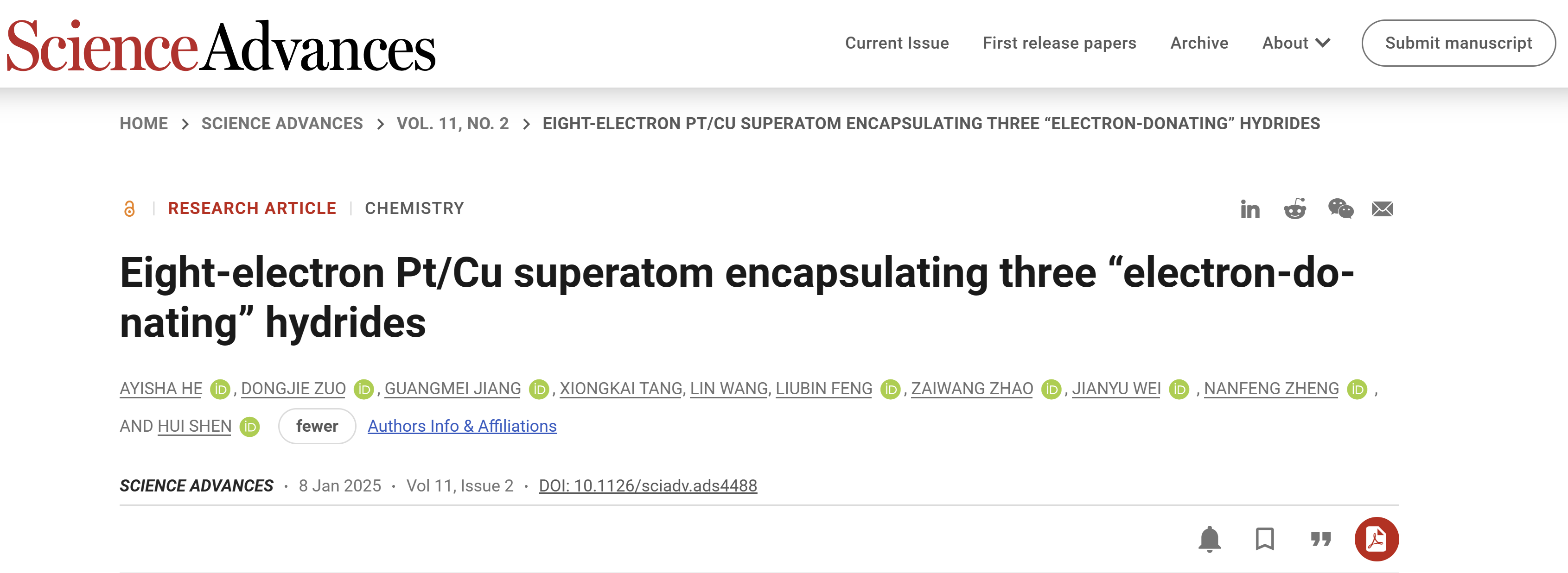 近日,性吧 魏建宇课题组与内蒙古大学沈慧教授团队、厦门大学郑南峰院士团队通力合作,在纳米团簇中的“金属氢”领域取得了突破性成果。他们成功将单个团簇中“金属氢”的数目提升至3个。相关研究成果以“Eight-Electron Pt/Cu Superatom Encapsulating Three “Electron-Donating”Hydrides”为题,于2025年1月8日在Science Advances上发表。