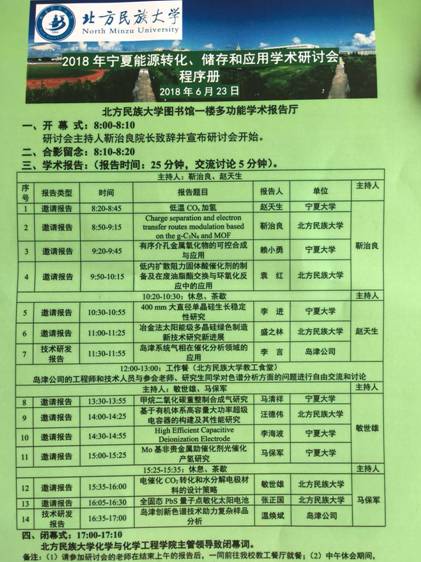 2018年宁夏能源转化、储存和应用学术研讨会于2018年6月23日在北方民族大学图书馆多媒体报告厅举行。该学术会由北方民族大学“电化学能源转化技术开发和应用重点实验室”主办,岛津公司赞助。会议以“共商能源大计、共促学科发展”为主题,共同探讨了能源领域研究的新思路、新领域和新趋势。