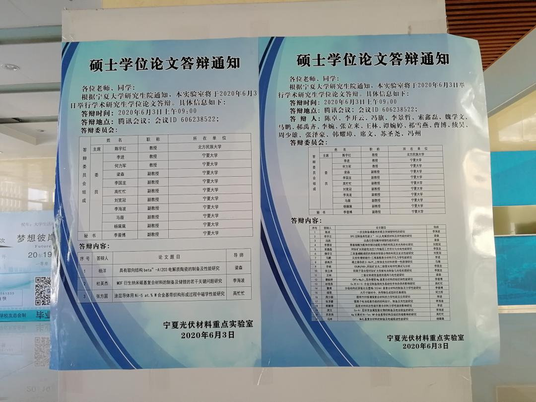 进入新冠疫情防控常态化阶段以来,宁夏光伏材料重点实验室严格遵守和落实学校有关文件会议精神和要求,一方面做好疫情防控工作,一方面有序推进教学科研工作的开展。2020年6月3日,2020届首次硕士研究生学位论文答辩工作在网上进行,分散在全国十几个省区共24名同学参加了答辩。答辩委员会成员参会地点在性吧