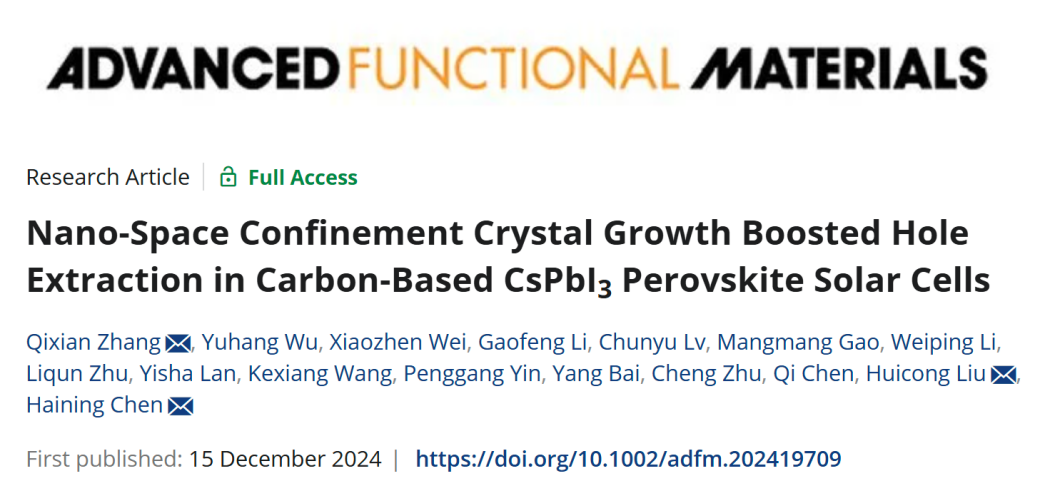 近日,学院光伏组件回收及高值利用团队青年教师张啟先在全无机碳基钙钛矿太阳能电池研究中取得重要进展,相关工作以“Nano-Space Confinement Crystal Growth Boosted Hole Extraction in Carbon-Based CsPbI3Perovskite Solar Cells”为题发表在材料科学领域国际权威期刊《Advanced Functional Materials》(Q1/IF 18.5),性吧