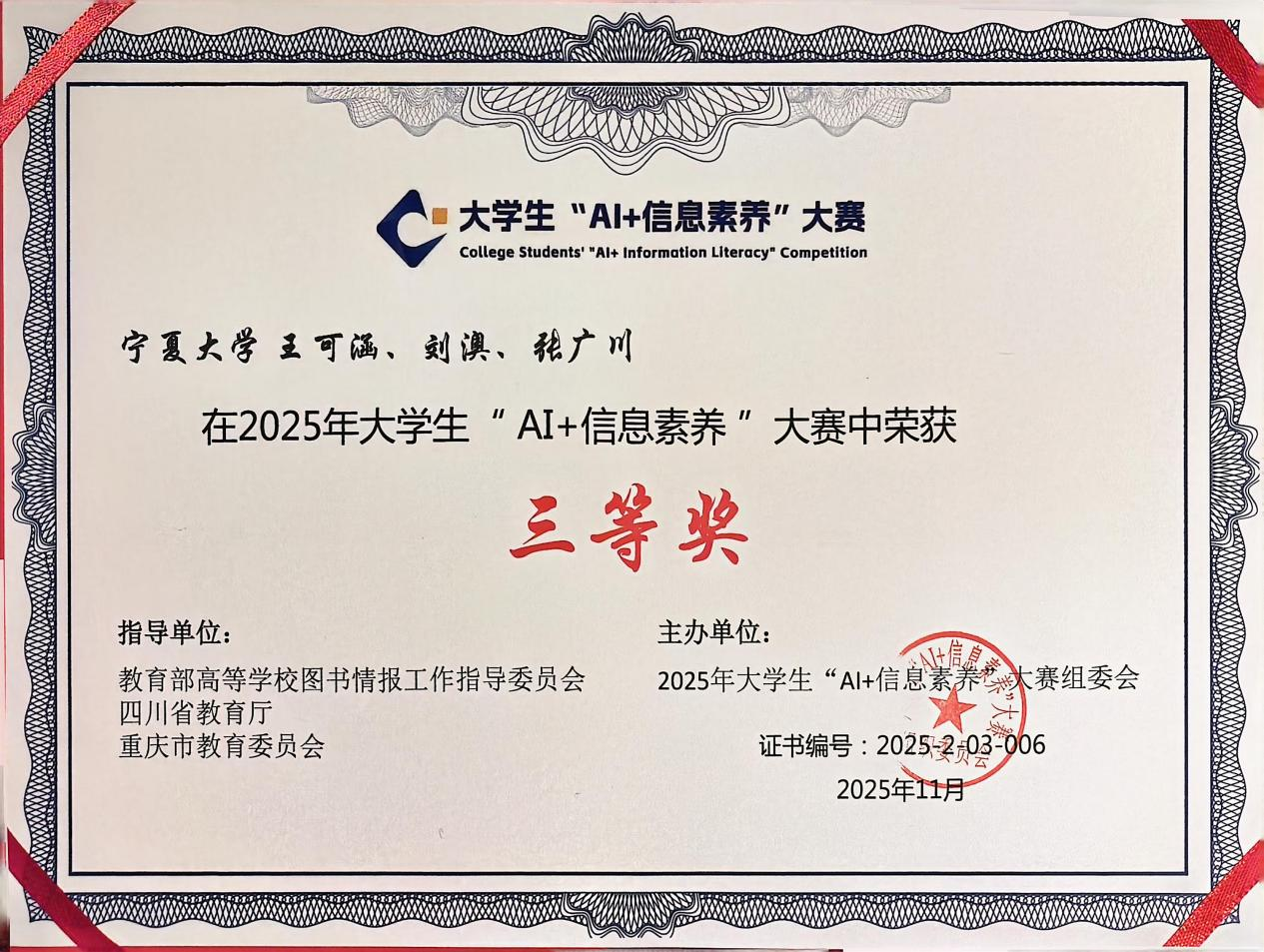 近日,2025年大学生“AI+信息素养”大赛联赛(本科生、研究生)暨信息素养教育教学工作研讨会在成都圆满落幕。性吧 研究生王可涵、刘澳等3人组成的参赛团队,在马薇副教授的悉心指导下,凭借扎实的专业功底与出色的综合素养,从全国众多参赛队伍中脱颖而出,荣获研究生组全国三等奖。