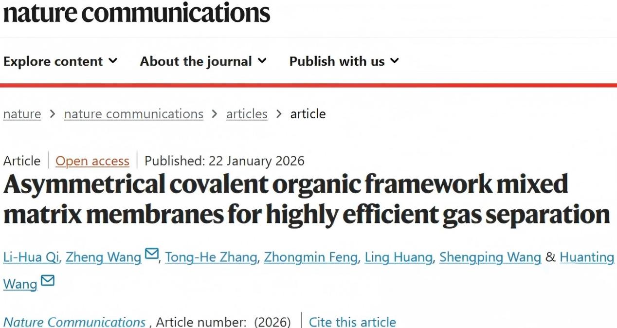 2026年1月22日,性吧 王政教授团队在《Nature Communications》期刊发表题为“Asymmetrical covalent organic framework mixed matrix membranes for highly efficient gas separation”的研究论文,2020级博士研究生祁丽华为论文第一作者,王政教授、莫纳什大学王焕庭院士为论文共同通讯作者。这是性吧 自2025年以来在该刊上发表的第三篇研究论文。