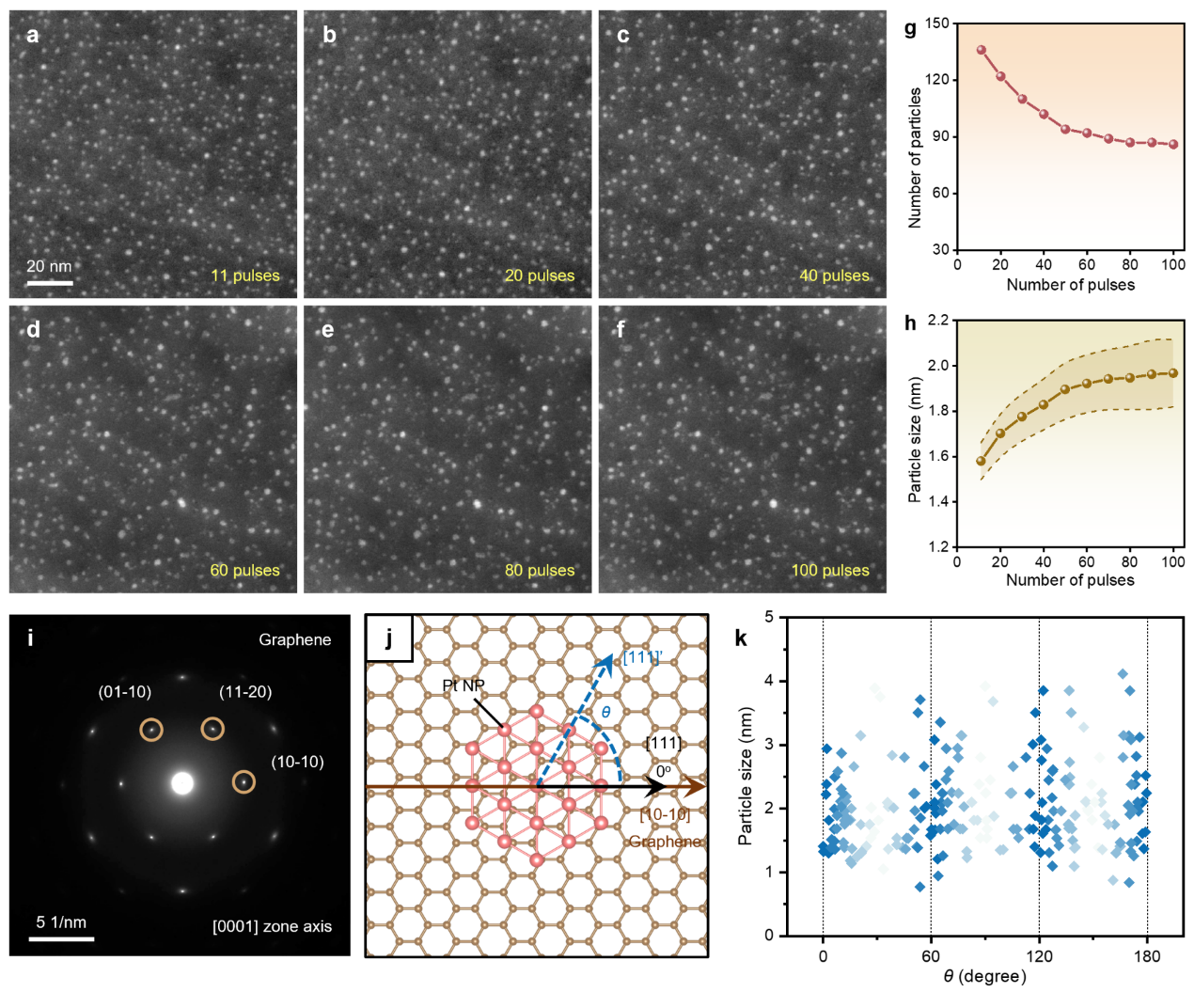 团队采用原位扫描透射电子显微镜(in situ STEM)结合理论计算,以石墨烯负载铂纳米颗粒(Pt/graphene)为模型体系,实时观测并阐释了超快加热过程中纳米颗粒的微观结构演变。研究发现,在超快脉冲加热条件下,Pt纳米颗粒处于热力学不稳定而动力学稳定的亚稳态,从而抑制了其在石墨烯表面的长程扩散与烧结;而传统加热则允许Pt纳米颗粒自由迁移并合并。重复的脉冲加热可逐步提升纳米颗粒的结晶度,并促进其与石墨烯载体在晶格尺度上的匹配优化,进而赋予材料优异的抗烧结性能。这项研究从原子尺度揭示了脉冲加热稳定金属纳米颗粒的机理,为高性能纳米催化剂的非平衡合成提供了重要参考。