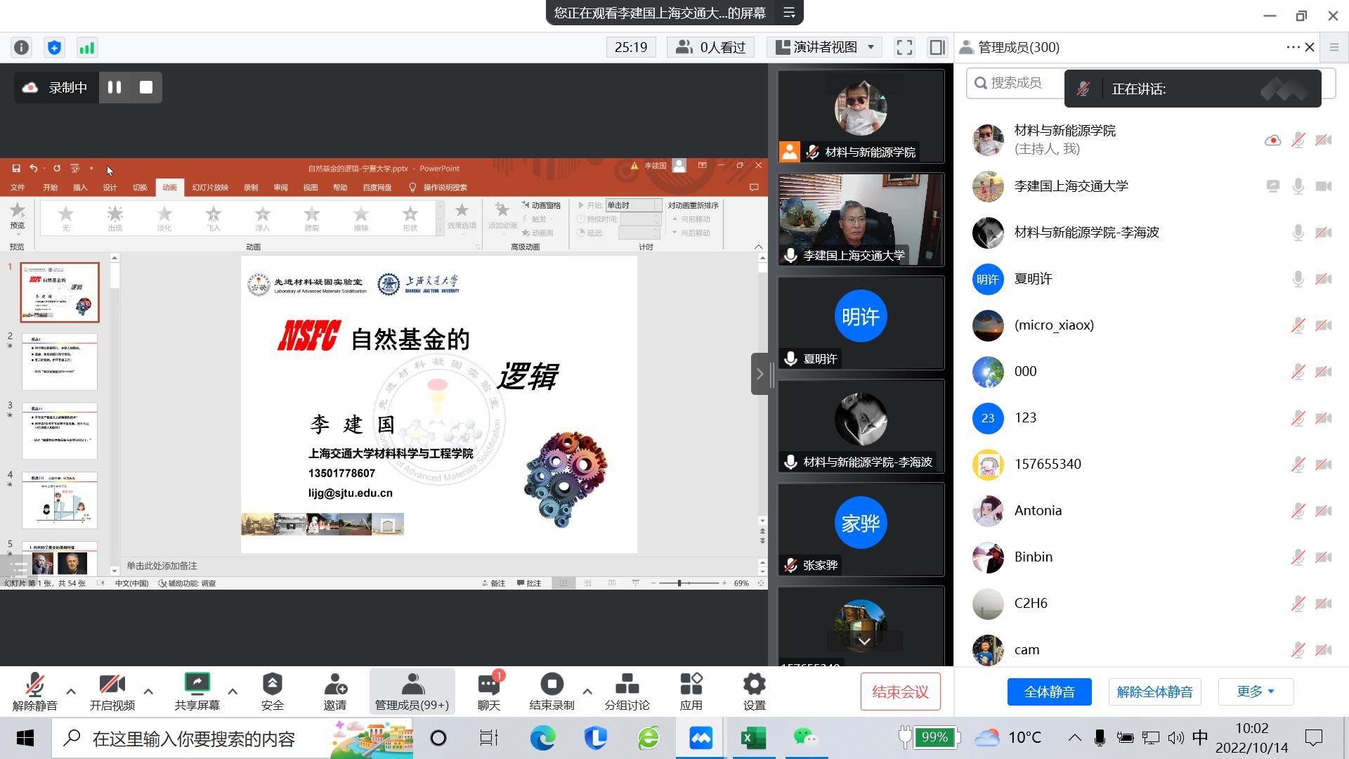 2022年10月14日上午,学院通过线上会议形式举办了“基金周周讲”第二期报告。报告由李海波副院长主持,上海交通大学材料科学与工程学院李建国教授主讲,学院全体教师参加,全国高校相关领域教师共计500余人聆听了报告。