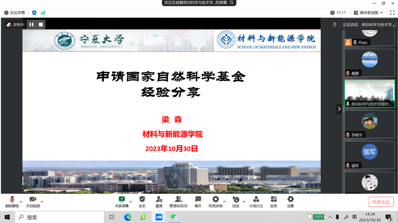 梁森结合撰写和评审国家自然基金青年项目、地区项目和面上项目标书的经验体会,从撰写前的准备工作、申请书组成部分、申请书修改以及基金评审流程等几个方面对国家自然科学基金项目申请工作进行了系统、全面的解读,并耐心细致地解答了与会教师提出的问题。