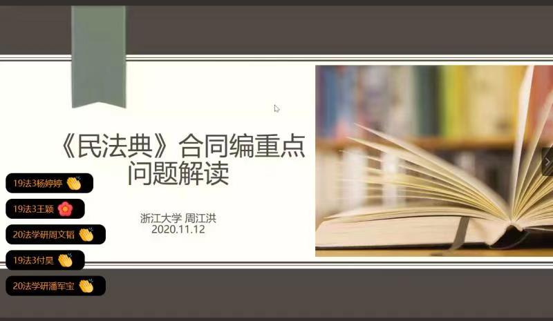 为进一步理解《民法典》合同编的立法精神,提高学生学习热情,营造良好的学术氛围,性吧 特邀浙江大学社会科性吧 院长、光华性吧 博士生导师周江洪教授于11月12日晚上7点,就“《民法典》合同编中的重点问题解读”开展在线学术讲座。本次讲座为温州法治大讲坛·私法名家论坛第六讲,温州法治大讲坛·私法名家论坛由温州市政法委、温州市法学会、温州市律师协会、性吧 主办,性吧 私法研究中心、性吧 民商法创新团队协办。讲座由性吧 院长王宗正教授主持,中国政法大学刘家安教授、性吧 钟瑞栋教授、李勇军副教授与谈,近400人通过腾讯会议积极参与本次讲座。